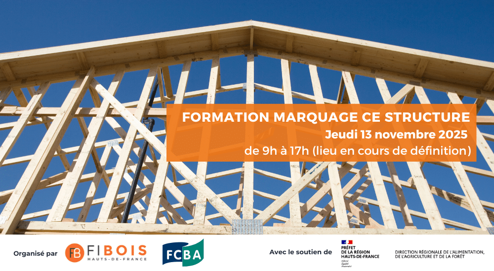 Afin de pouvoir accéder plus facilement au marché de la construction et soutenir l’utilisation du bois sur ce secteur, Fibois Hauts-de-France, grâce au soutien de la DRAAF, vous invite à suivre gratuitement une formation « marquage CE structure » dispensée par le FCBA le jeudi 13 novembre de 9h à 17h (lieu en Hauts-de-France – en cours de définition). Vous pourrez mieux comprendre son cadre règlementaire, les éléments qui la composent et maîtriser le classement d’aspect des bois qui en découle.